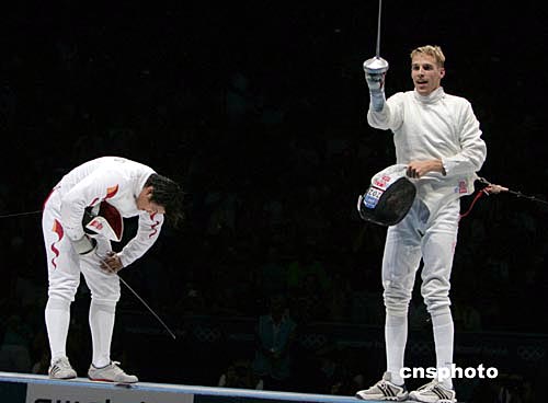 当地时间8月17日晚,中国剑客王磊在雅典奥运会男子重剑决赛中以9:15不敌瑞士名将费舍尔,获得亚军。中新社记者:任晨鸣