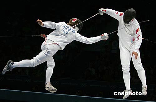 当地时间8月17日晚,中国剑客王磊在雅典奥运会男子重剑半决赛中击败俄罗斯选手获得决赛权。中新社记者:任晨鸣