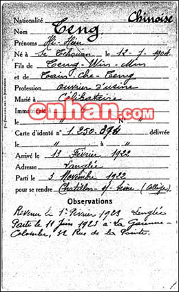卡片的主要内容为———国籍:中国;姓名:邓希贤;出生:四川,1904年7月12日(中国农历———编者注);父亲:邓文明;职业:工厂工人;婚姻状况:未婚;身份卡号码:1·250·349;到达日期:1922年2月13日;居住地点:leangle;离开时间:1922年11月3日;目的地:赛纳-夏狄戎中学;备注:1923年2月1日重返leangle;1923年6月11日离去,前往拉加雷纳-科隆市的德拉普安特街39号。