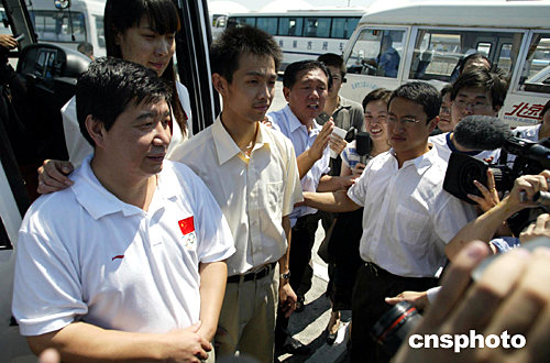 首批回国的运动员包括为中国赢得本届奥运会首枚金牌的射击选手杜丽、奥运会六朝元老王义夫和首次参加奥运会就夺得男子10米汽步枪冠军的19岁小将朱启南等。