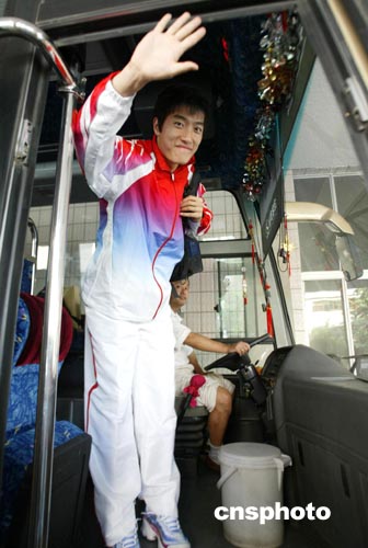 8月18日,中国田径队包括刘翔在内的第二批运动员在北京国家体育总局训练局集合,踏上赴雅典奥运会的征程。图为刘翔蹬车向队友挥手告别时显得信心十足。中新社记者:盛佳鹏