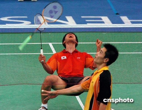 中国羽毛球男单选手陈宏(前)在雅典奥运会羽毛球男子单打比赛中以一比二不敌韩国选手孙升模无缘四强。作者:陈佳