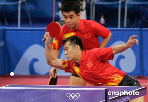 在当地时间8月18日举行的雅典奥运会乒乓球男双比赛中,中国选手孔令辉、王皓不敌瑞典老将佩尔森、瓦尔德内尔,无缘晋级八强。中新社记者:张炜
