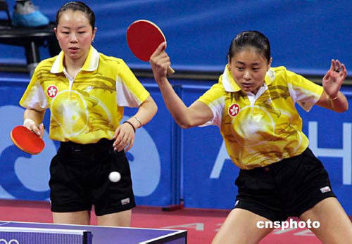 当地时间八月十八日,在雅典奥运会乒乓球女双1/4决赛中,中国香港选手桑亚蝉、帖亚娜被王楠、张怡宁以2:4淘汰。中新社记者:张炜