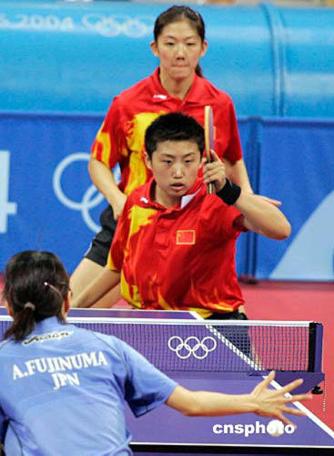 当地时间八月十八日,在雅典奥运会乒乓球女双1/4决赛中,中国选手郭跃、牛剑锋以4:2击败日本选手福原爱、梅村礼,晋级四强。中新社记者:张炜