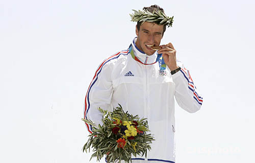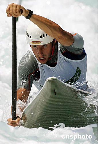 法国选手托尼·埃斯坦盖在当地时间8月18日的赛事比赛中夺得单人划艇障碍回转决赛冠军后登台领奖的画面。