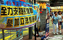 香港2004年立法会选举在即,民建联八月十九日在湾仔闹市街头悬挂出醒目的标语为参加立法会选举造势。中新社记者:钱兴强