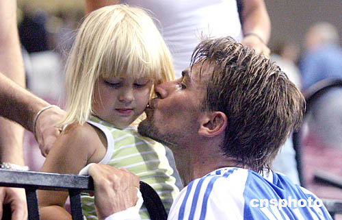 图为在当地时间8月18日举行的男子手球比赛中,希腊选手Vago VOGLIS给场边一小球迷深情一吻。