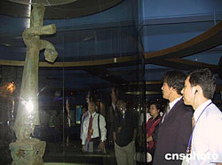 来自世界五大洲三十一个国家的百余位海外华侨华人代表,八月十九日上午专程来到展示古蜀灿烂文明的三星堆参观专程前来参观。图为他们在欣赏“群巫之长”青铜大立人像。作者:杨杰