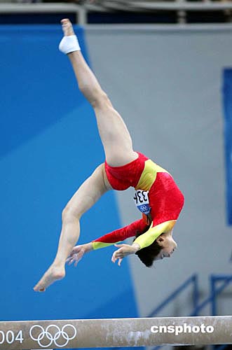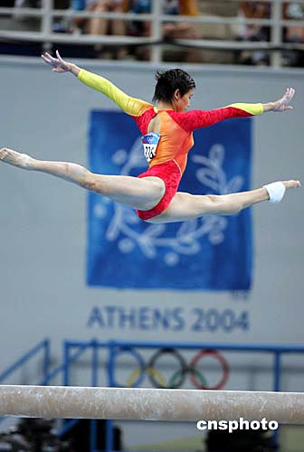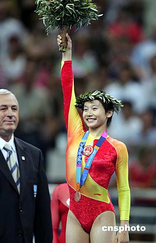 当地时间八月十九日晚,中国体操选手张楠获得雅典奥运女子体操全能铜牌。中新社记者:毛建军