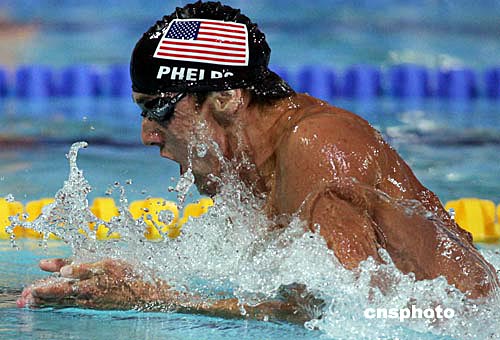 当地时间八月十九日晚,美国超级明星菲尔普斯在雅典奥运男子二百米个人混合泳比赛中赢得冠军并打破了奥运会纪录。中新社记者:毛建军