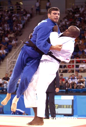 当地时间8月19日,希腊选手Vasileios与古巴选手Oreidis在男子100公斤级柔道赛场上一争高下。