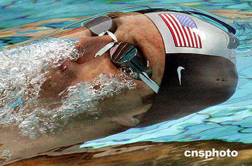 图为美国选手Aaron Peirson在男子200米仰泳比赛中被捕捉到的一个镜头。