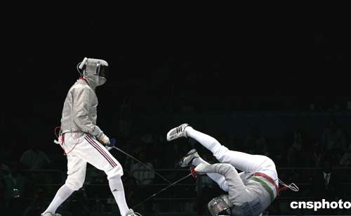 图为当地时间8月19日进行的男子击剑团体赛中,获得冠军的法国队在决赛中对阵意大利队的场景。