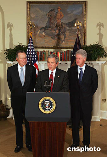 中新网1月4日电 据美联社报道,3日,美国总统布什与该国两位前总统——他的父亲老布什以及他的前任克林顿一道,呼吁美国人打开他们的钱包,为在印度洋海啸中几百万无家可归的灾民募捐。