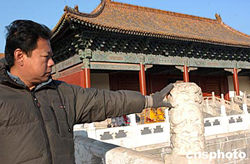 北京太庙戟门前金水桥防风化保护工程日前完工。经过几百年的风吹日晒和酸雨的侵蚀,太庙戟门前金水桥的部分栏板和望柱出现不同程度的裂纹,风化严重地方甚至出现整体疏松现象。为此,文物部门采用防风化、耐老化等性能最好的化学材料,对此石质文物进行了化学保护,并更换了部分雕龙汉白玉望柱(图)。太庙位于紫禁城的左前方,建于1420年,是皇宫外朝重要组成部分,和中国目前仅存且保存最完整、规模最大的皇家祭祖建筑群。此次工程也包括太庙牺牲所的修缮,总用资100万元人民币。中新社记者:邹宪