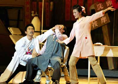 去年的《麻花1》中,主持人何炅的演技令人拍案叫绝。今年《麻花2》中的林依轮也不负众望。一向以青春健康著称的林依轮变身一个吊儿郎当的年轻医生,身穿白大褂的他一上场便玩起了“乱打”。只见他挥舞着两根一尺多长的“针灸专用针”,在一个饮水机的空塑料桶上尽情敲打,铿锵有力的鼓点赢得了观众们雷鸣般的掌声。和林依轮配合的是手拿“心脏起搏器”和给骨折病人正骨的护士们,只听“心脏”“怦怦”作响,“骨节”嘎嘎乱叫,和林依轮的“鼓点”配合得天衣无缝,一场“医院乱打”就这样神奇地开场了。