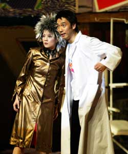 去年的《麻花1》不论从情节还是舞美都带有写实主义的风格。何炅、于娜把矫情的歌星、农民暴发户、虚伪的文化人和电影《英雄》中的秦始皇“原封不动”地搬上了舞台,台上的布景也在农村炕头、作家书房、秦始皇宫殿中转换。对现实生活的反讽和逼真的舞台陶醉了大批的观众。