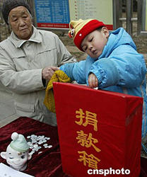 北京一名年仅三岁的幼童在奶奶的陪伴下,将积攒的硬币一枚一枚地投入社区的捐款箱,救助印度洋地震海啸灾民。