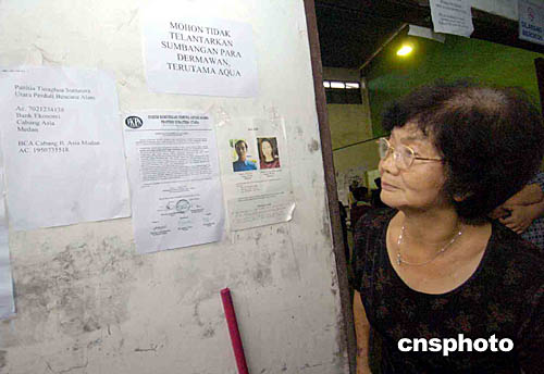 印度尼西亚棉兰市华族收容所内张贴在海啸中失踪的民众,虽然失散的亲人凶多吉少,但还是令寻找亲人的老妇久久不想离去。