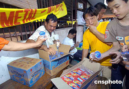 1月7日,在印度尼西亚棉兰市的难民避难所内,遭受海啸灾难影响的班达亚齐灾民分享华族团体送来的赈灾食品。作者:洪少葵