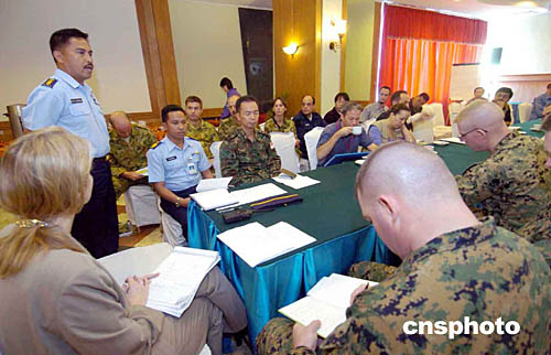 1月7日,在印度尼西亚棉兰市的国际救援组织召开会议,来自澳洲、美国及新加坡军方官员在会上商讨利用军用设施将人道救援物资送到班达亚齐灾区,印度尼西亚军方后勤部官员介绍后勤支持情况。作者:洪少葵