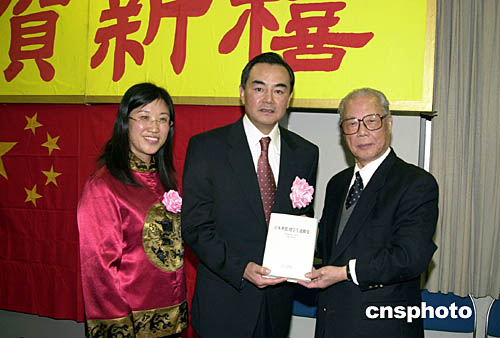 历经十五年编纂而成的六十万字的侨史力作《日本华侨·留学生运动史》,日前在东京出版面世。这本凝聚日本侨界心血的历史专著,填补了在日华侨和留学生史料的大量空白,获得各界高度评价。图为该书主编、著名侨领陈焜旺先生(图右),在八日于东京举行的日本侨界迎新联欢会上,向王毅大使(图中)和中国驻日本大使馆总领事于淑媛(图左)赠送该书。作者:王健