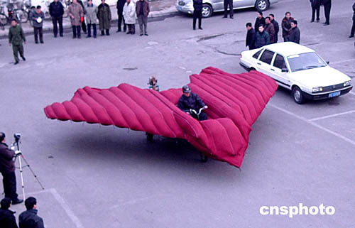中新网1月9日电(记者史宝银)7日下午四时许,由高级工程师张炳炎研制的软体飞机在河南省新乡县政府院内进行了第二次试跑。