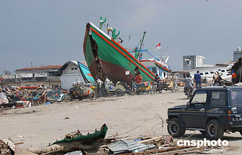 印度尼西亚海啸灾难已历经十五日,1月9日,在班达亚齐伯纳永区灾区最「壮观」的景象应属船只被冲上岸。据当地人介绍,海岸离市区约有四、五公里远,即是说,这些船被冲出了四、五公里远,可见海啸的冲击力。