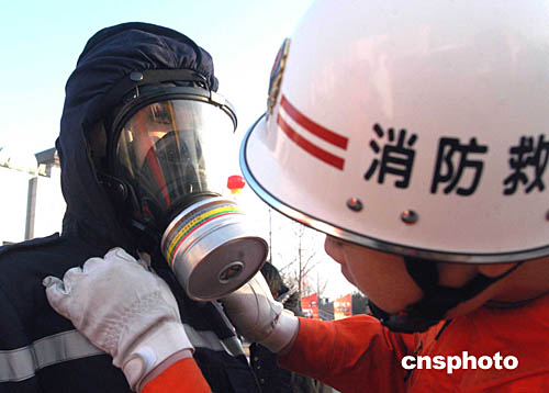1月10日是“110”报警服务台建台19周年纪念日,110报警服务台在北京西单文化广场举办“110”主题宣传活动。图为消防队员在向市民展示防化防核服。中新社记者:张宇