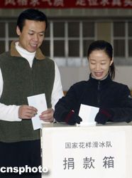 一月十日日,中国国家花样滑冰队在北京首都体育馆花样滑冰训练场举行向东南亚海啸灾民捐款活动。中国花样滑冰名将申雪、赵宏博当场捐献出一个月工资。作者:盛佳鹏