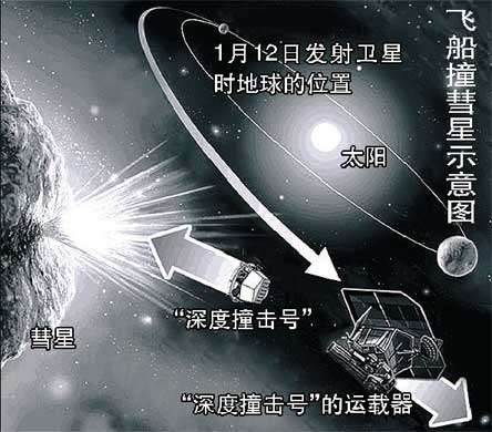 中新网1月12日电 国际在线消息:美国国家航空航天局(NASA)近日传出消息,一艘名为“深度撞击号”的飞船将于1月12日升空;6个月后,其搭载的撞击器将直接冲向“坦普尔1号”彗星的彗核,完成人类首度撞击彗星。此次撞击将首次获取大量彗核碎片,为人类探究太阳系起源提供新的线索,也为地球遭遇小天体撞击时“转守为攻”积累数据。