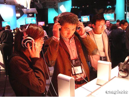 一月六日在美国拉斯维加斯开幕的二00五国际消费电子展,吸引世界各地的商家及消费者。图为来自中国大陆的参观者在索尼展台前试听音响。作者:潘旭临