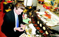 在华埠餐厅,东主夫妇送上越式牛肉汤粉。市长要了一双筷子,用筷子很自如地吃汤粉。
