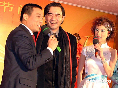 第七届中国长春电影节1月12日晚在长春落幕,众多明星出席当晚的颁奖晚会。图为担任颁奖嘉宾的香港影星赵文瑄(中)和主持人。作者:吴兆飞