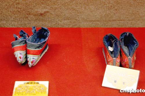 图为展出的难得一见的“三寸金莲”绣花鞋,俗称“小脚鞋”,又称作“弓鞋”、“半弓”。作者:刘卫勇