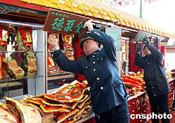 春节将至,北京东城工商分局加强对食品进行安全检查。在检查中一超市在北京特产“全聚德”烤鸭招牌下出售非“全聚德”烤鸭并悬挂“全聚德”招牌,对消费者造成误导,工商执法人员将其招牌摘下。作者:罗伟