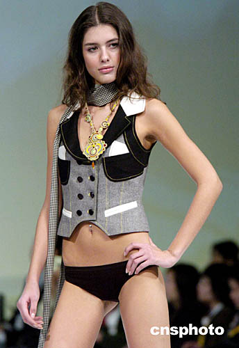 1月19日,在香港举行的“香港时装节秋冬系列2005”上,一台独家时装表演专场为观众带来青年设计师及品牌精选,图为模特展示GEESSEN品牌作品。作者:洪少葵
