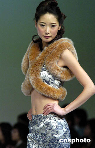1月19日,香港会展中心举行的“香港时装节秋冬系列2005”上,模特展示一款皮草披肩。作者:洪少葵