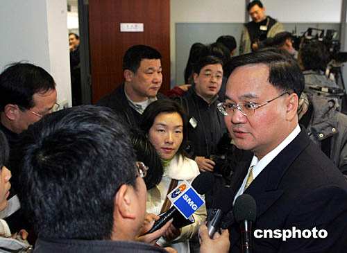 一月十九日,东航与华航在上海签订地面代理协议。图为华航地勤服务处副处长表示,两岸春节包机在台湾地区的订票热烈程度不比内地差,希望两岸春节包机今后成为惯例。作者:潘索菲