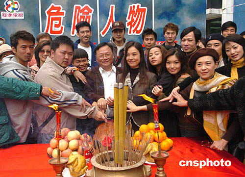 香港电视剧《危险人物》19日在香港亚洲电视台举行开镜拜神仪式﹐剧组制作总监梁立人和节目主持人翁静晶及剧组全体人员到场诚心拜神﹐祈求拍摄顺利。中新社记者:赵振清