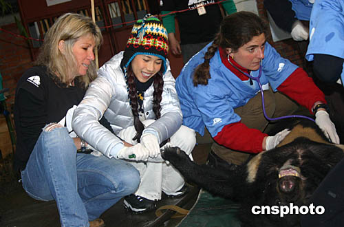 一月二十日,“拯救黑熊”爱心大使、香港艺人莫文蔚再次到访亚洲动物基金位于成都的黑熊救护中心,正式认养一头刚被四川省林业厅解救的亚洲黑熊,并为这头幸运的黑熊命名为“宝贝”。图为莫文蔚(中)与亚洲动物基金创办人及行政总监谢罗便臣女士(左一)一起为这头黑熊做身体检查。作者:鲁彦