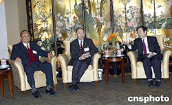 一月二十日,国务院港澳办副主任陈佐洱(右)在北京港澳中心会见霍震寰团长、曾宪梓名誉团长率领的香港中华总商会访京团。中新社记者:史利