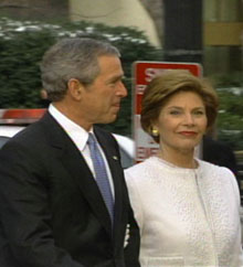 中新网1月20日电 据CNN报道,美国总统布什及第一夫人劳拉已经于美国东部时间周四上午9时许遵循传统惯例前往了圣约翰大教堂。
