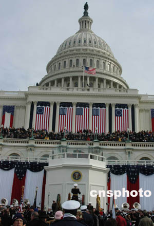 中新网华盛顿1月20日电(记者余东晖)在空前严格的保安下,获得连任的布什二十日中午在美国国会大厦前宣誓就任第五十五届美国总统。