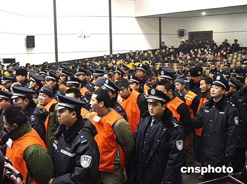 一月二十一日上午九时,许昌市中级人民法院对“中原涉黑第一案”——宋留根、马献洲、郝洪山特大涉黑团伙案,进行一审宣判。以宋留根为首的涉黑犯罪团伙是五十年来河南最大的犯罪集团。图为六十二名涉案人员在等待宣判。作者:胡珂