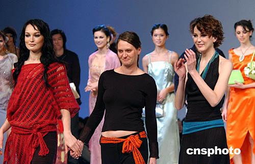 1月21日,在“香港时装节秋冬系列”及“香港国际时尚荟萃”上,举办第二场“国际时装设计师表演”,图为澳洲时装设计师Josephine Nathan与模特在掌声中登台谢幕。作者:洪少葵