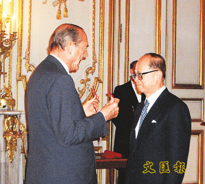 中新网1月25日电 据香港文汇报报道,法国政府早前向香港富商、长和系主席李嘉诚颁授荣誉军团司令勋章(Commandeur de la Legion d,honneur)。授勋仪式在上周四晚在巴黎总统府爱丽舍宫举行,由法国总统希拉克亲自主持。