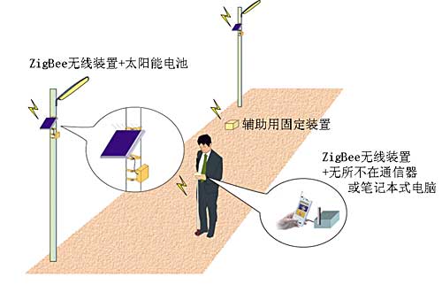 ZigBee技术与无线LAN和Bluetooth相比,具有省电力、确立通信所需时间短等优点。由于ZigBee技术具有省电力的特点,使用太阳能电池、利用无线电技术后,可以自由设置作为在街口发送信息的定向电波及测定人员所在位置的基准坐标的固定装置,被认为是普及自律移动支援服务的重要技术而深受期待。