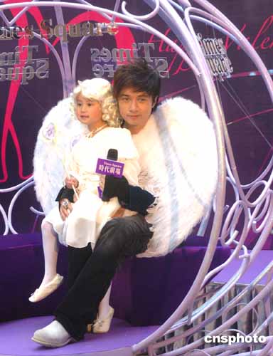 香港歌星古巨基与一小天使25日来到香港时代广场﹐登上为情人节特别装饰的“爱神丘比特南瓜车”上﹐倾诉他的深情蜜语﹐迎接情人节的到来。作者:赵振清